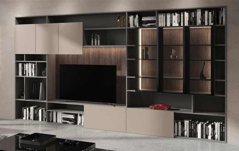 Мебель для гостиной 15 выполнена в стиле минимализм в светлых тонах. Мебель укомплектована тумбой под тв с ящиками, реечной и стеновой панелью и небольшой полочкой для мелочей. У полки и стеновой панели есть своя подсветка.