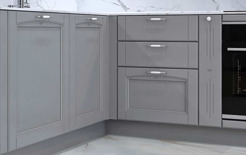 Основной цвет фасадов – нежный светло-серый, создающий спокойную и уютную атмосферу. Этот цвет прекрасно сочетается с теплым оттенком дерева стен и потолка.