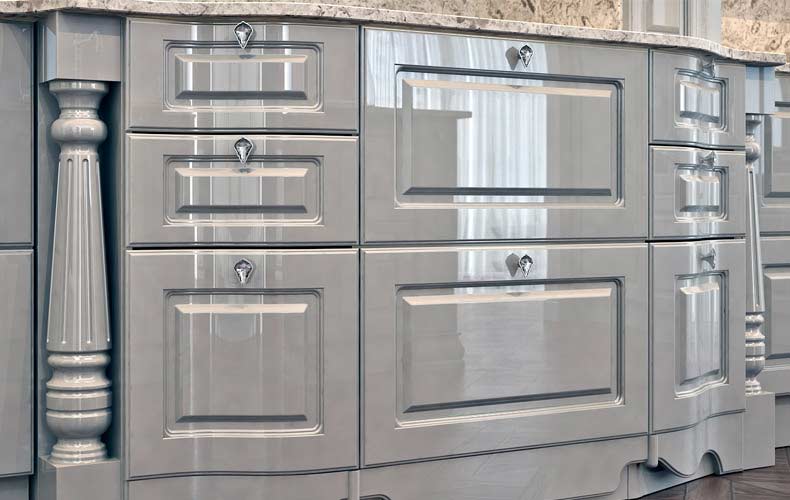 Прямой кухонный гарнитур Мария 3 представлен секцией с навесными шкафами, узкими колонками с витражами, нижней секцией с ящиками и шкафами и колонкой под встраиваемый холодильник. Столешница со стеновой панелью выполнены в декоре под мрамор. В комплекте гарнитура используется встроенная бытовая техника и локальная подсветка витражей.