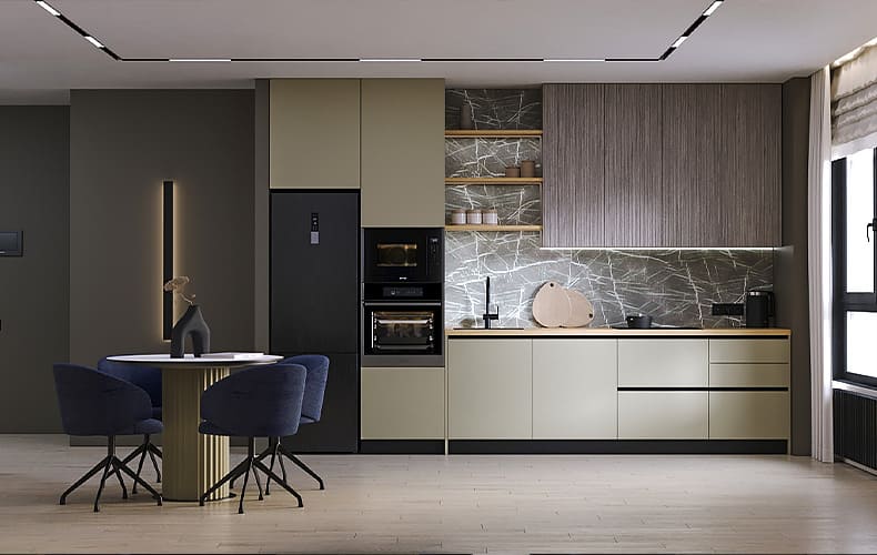 Кухонный гарнитур Маттео 25 - вариант с прямой конфигурацией, встроенной в нишу, для кухни-гостиной. Гарнитур представлен матовыми фасадами колонок, верхних и нижних шкафов и стеклами для навесной секции. В колонки вынесены духовой шкаф, свч-печь и холодильник. В рабочей зоне размещается мойка со смесителем, варочная поверхность и вытяжка. Установлена локальная подсветка.