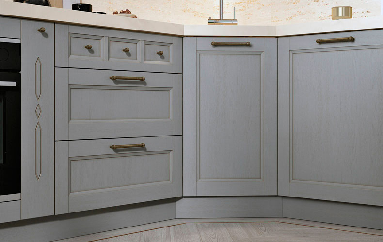 Кухонный гарнитур Оливия 5 выполнен в бежевых тонах и имеет угловую конфигурацию. Центральная часть гарнитура представлена нижними и верхними шкафами, оснащена встроенной техникой в ретро стиле и колонкой для встроенного холодильника. В угловой части располагается навесная открытая полка, секции с ящиками и шкафами с полками для хранения. Для рабочей зоны используется локальная подсветка.