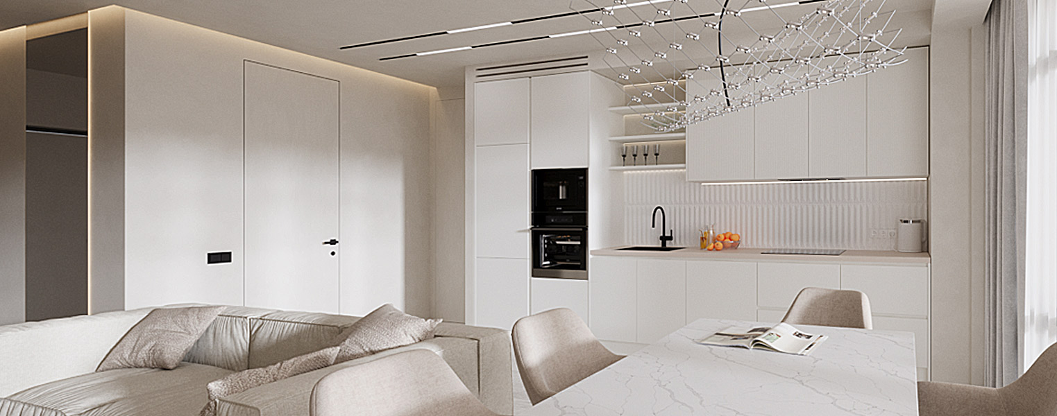 Светлая кухня прямой конфигурации. Колонки и столы с матовыми фасадами Тинто, шкафы с крашенными фасадами Линеа. Рабочая поверхность из влагостойкой ламинированной столешницы. Слева расположены колонки со встроенной бытовой техникой. Над мойкой открытые декоративные полки. В центральной части шкафов расположена врезная вытяжка над варочной поверхностью.