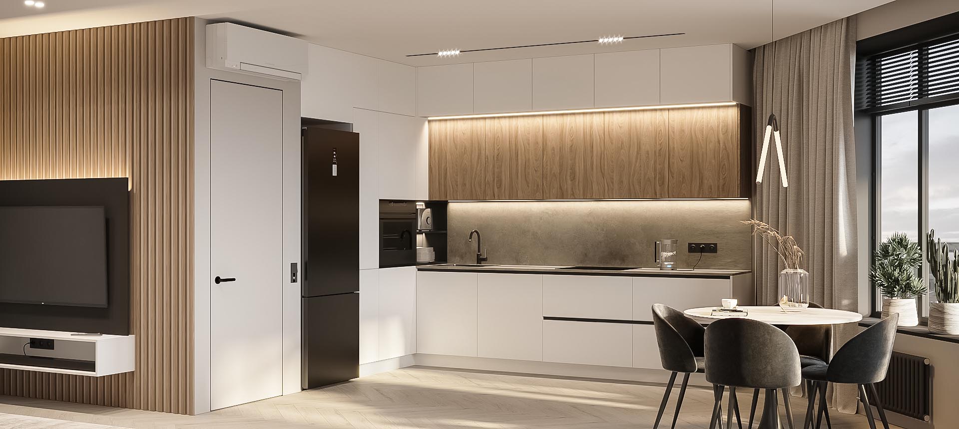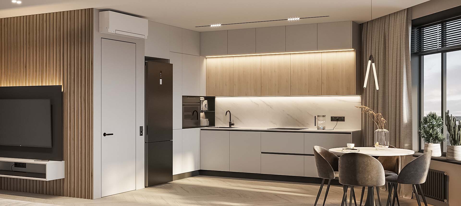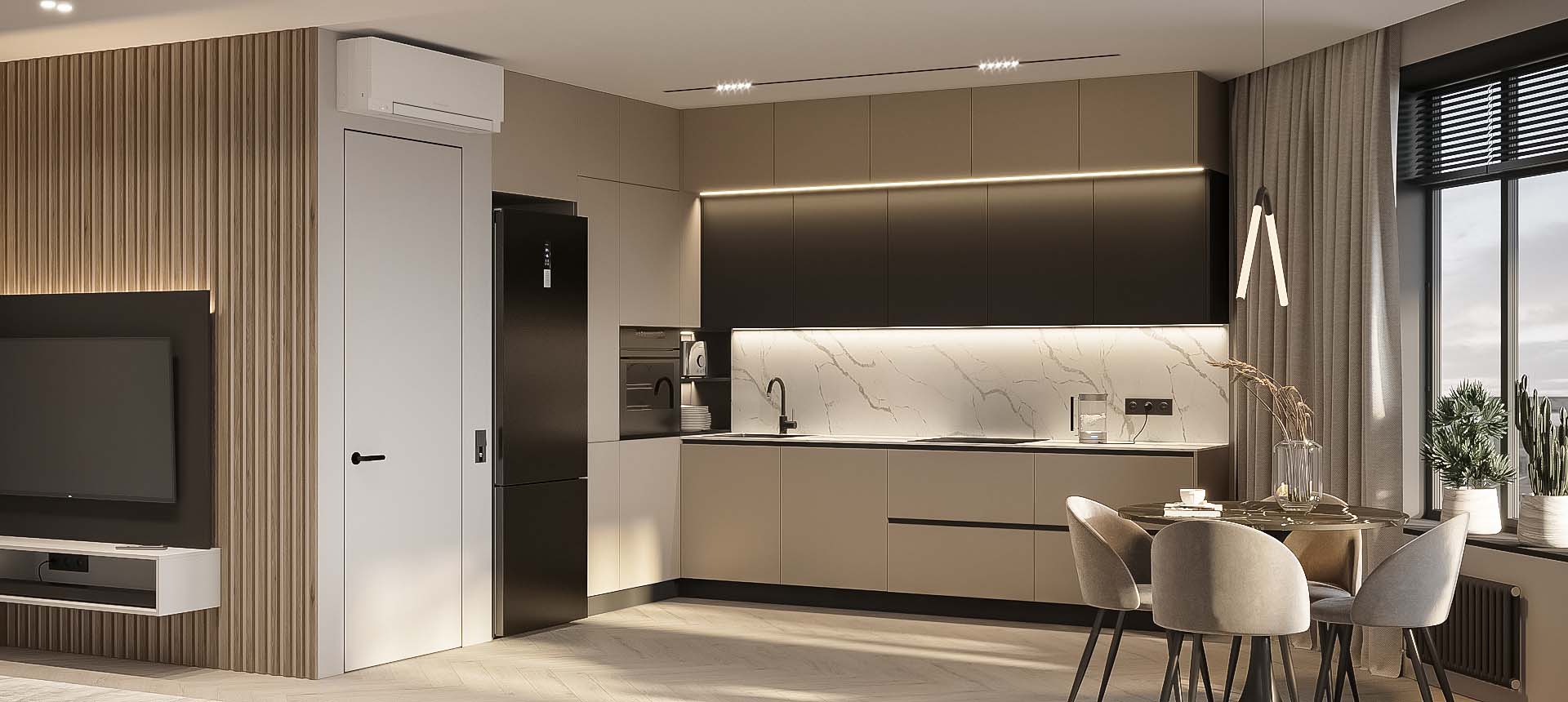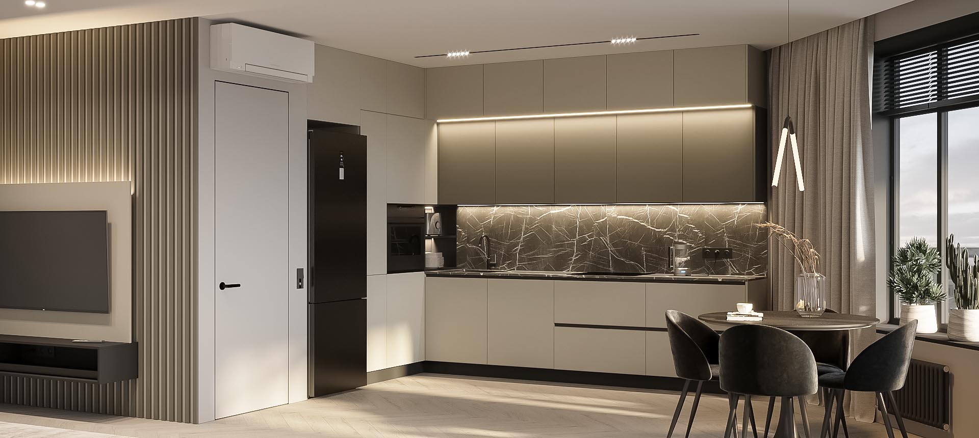 Светлая функциональная квартира в бежевых тонах для семьи из трех человек