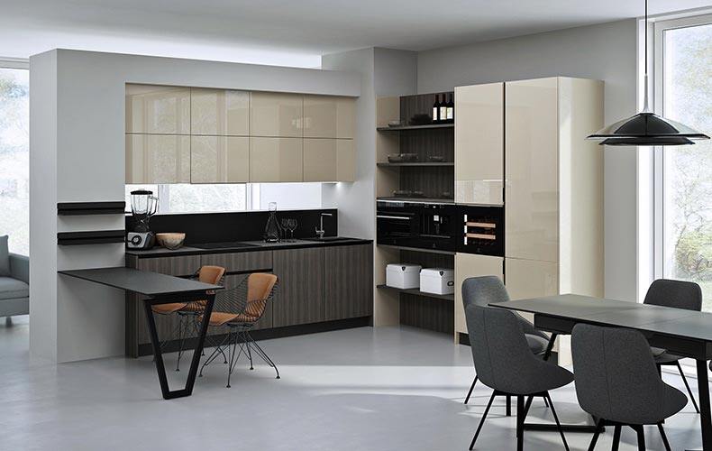 Кухонный гарнитур Сильвестро 5 представляет собой образец минимализма в прямой планировке. По бокам гарнитура расположены колонки под хранение и встраиваемую технику. В центре установлены нижние и верхние шкафы с полками и ящиками.
