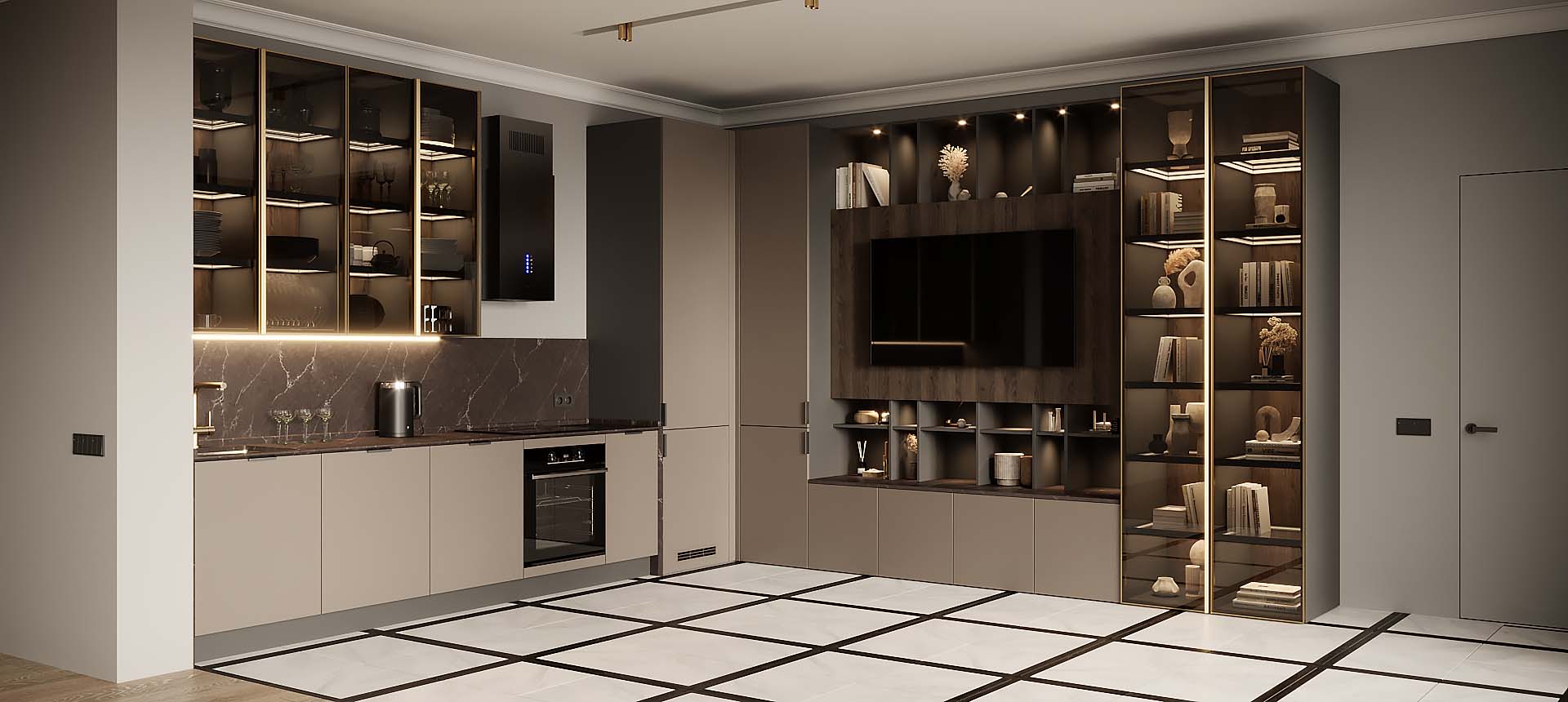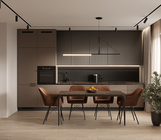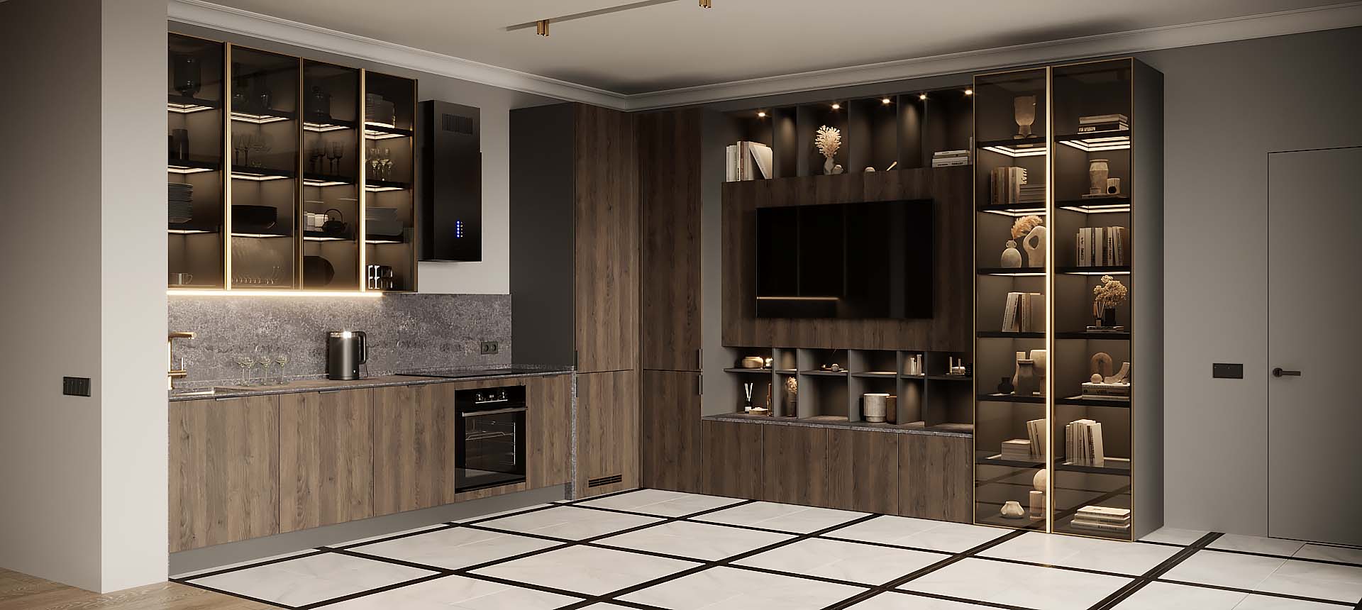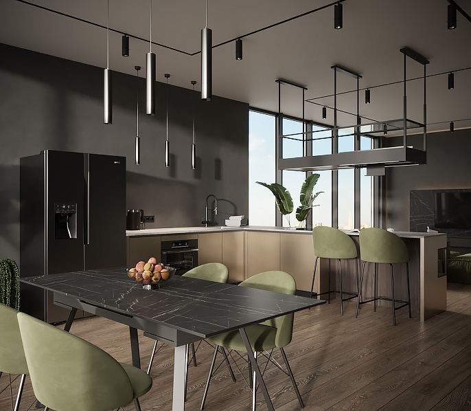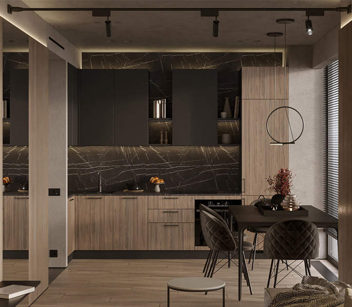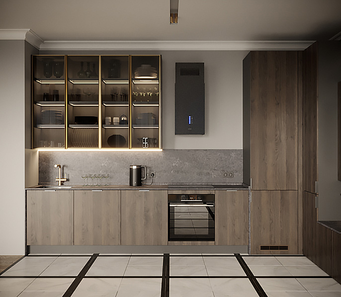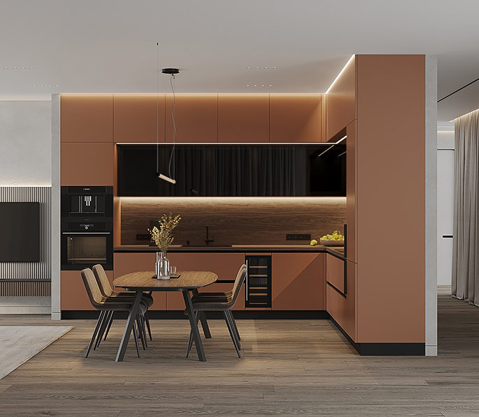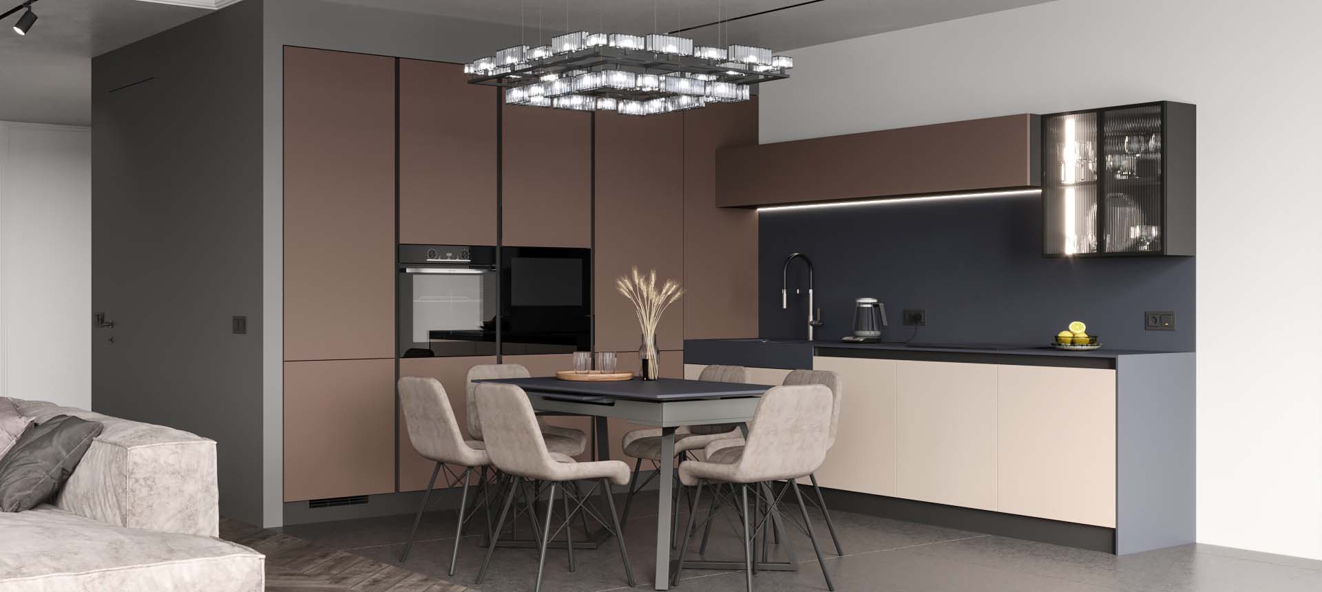 • Красивая кухня с золотыми акцентами в двухкомнатной квартире бизнес-класса