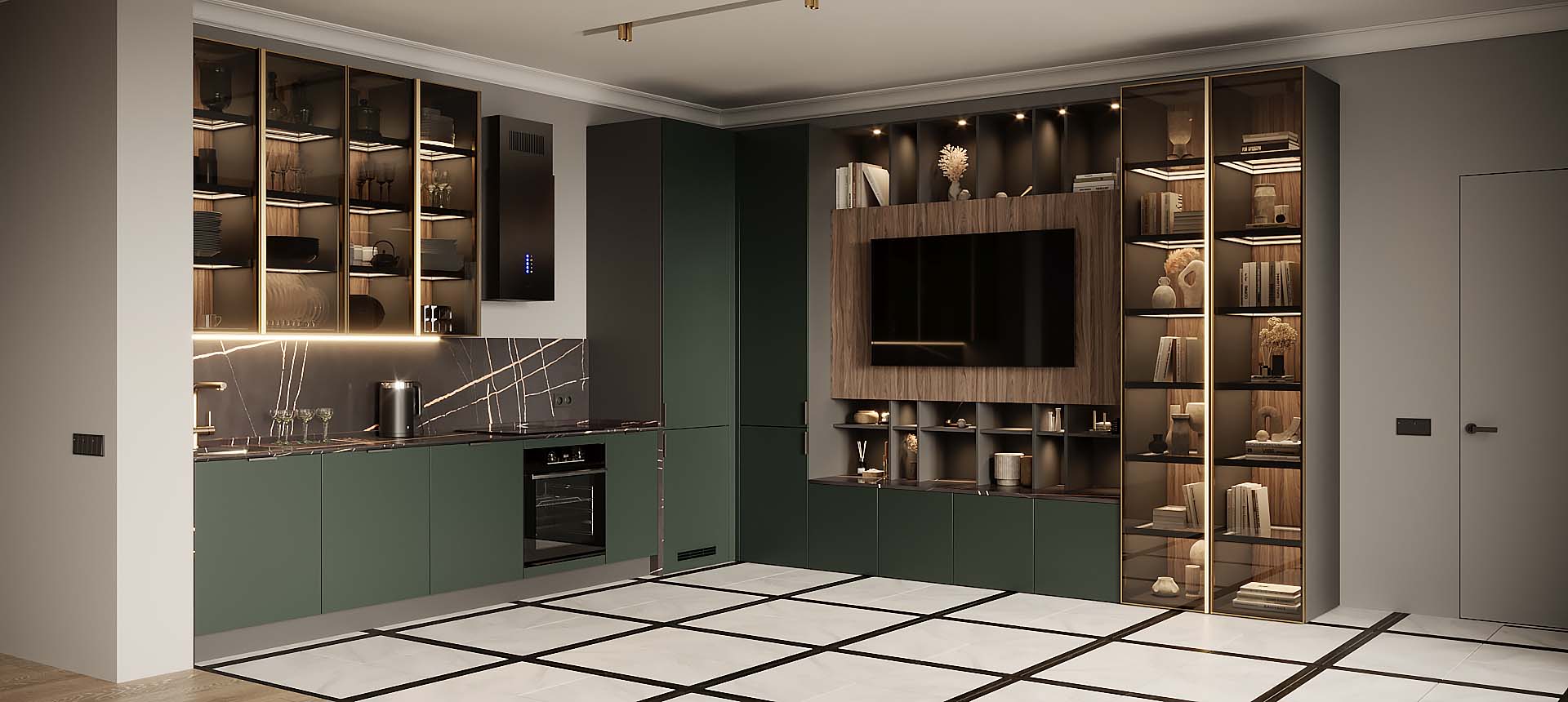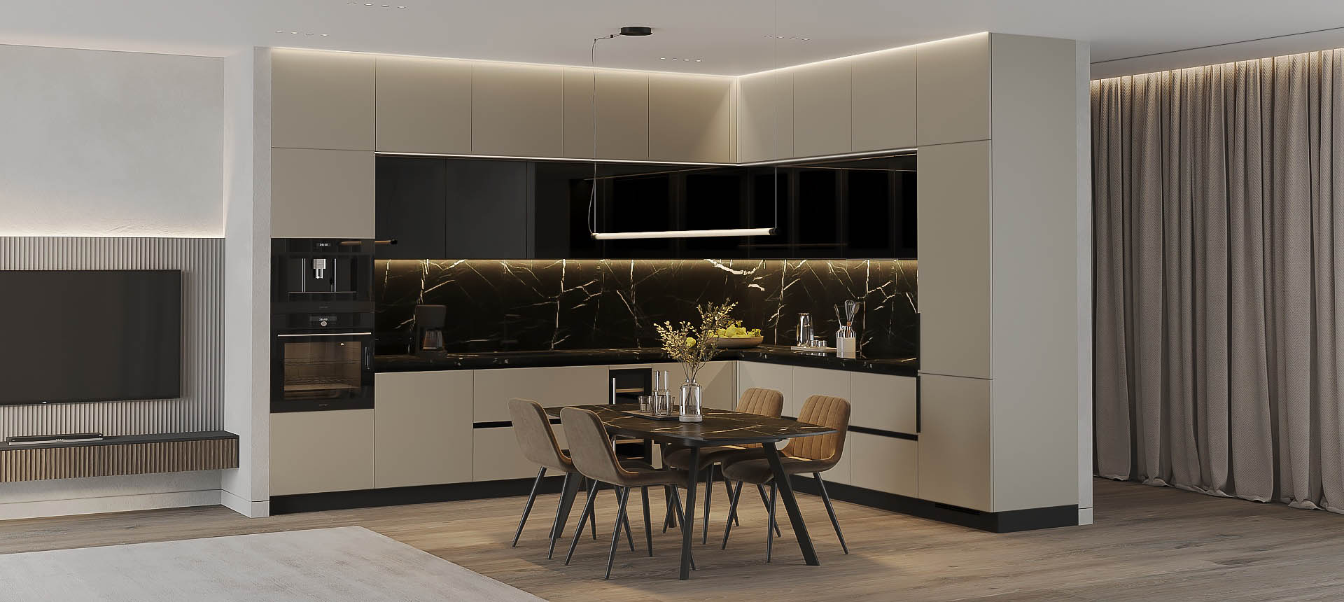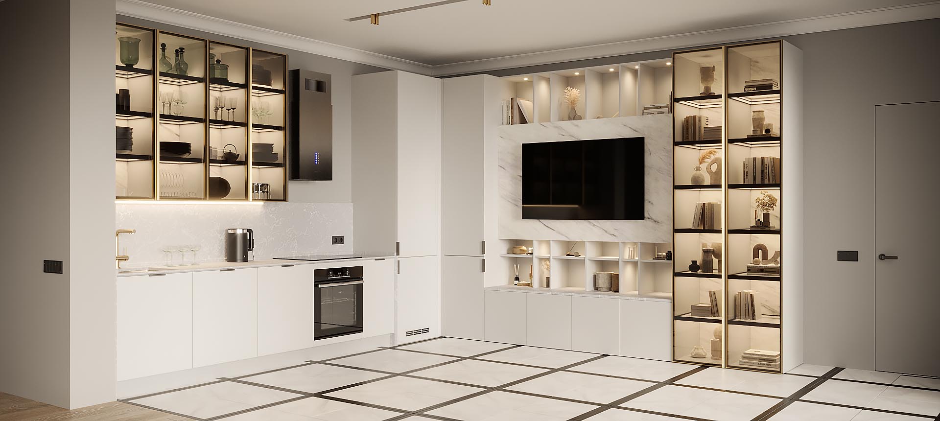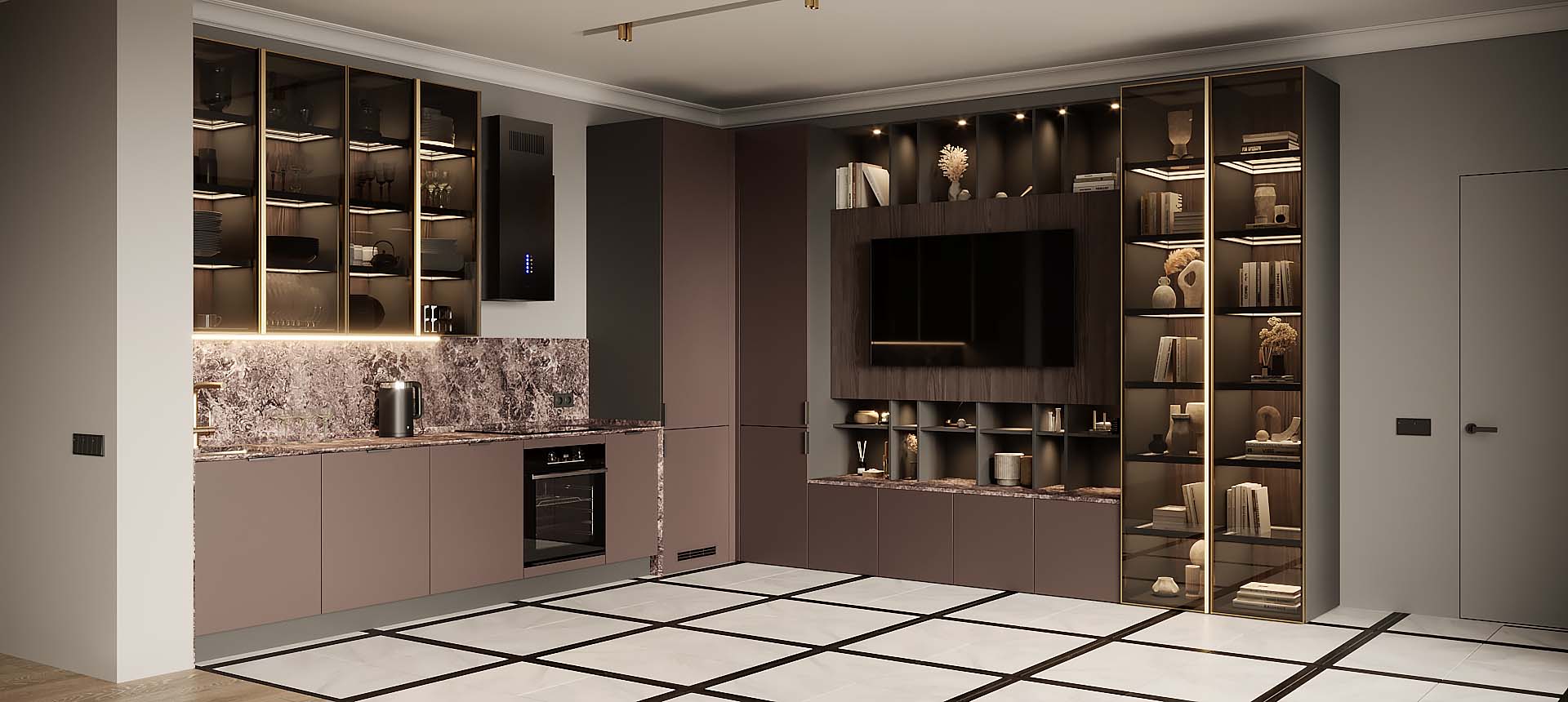 • Красивая кухня с золотыми акцентами в двухкомнатной квартире бизнес-класса