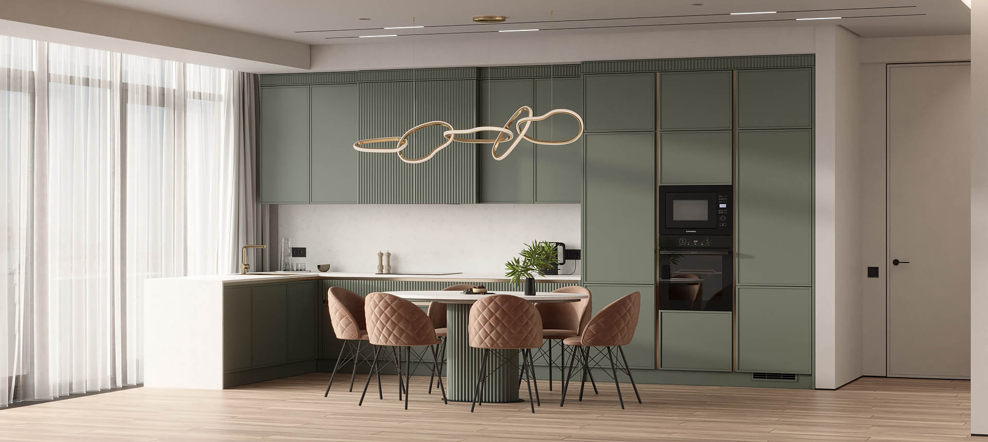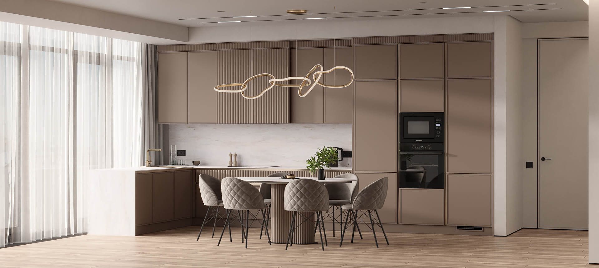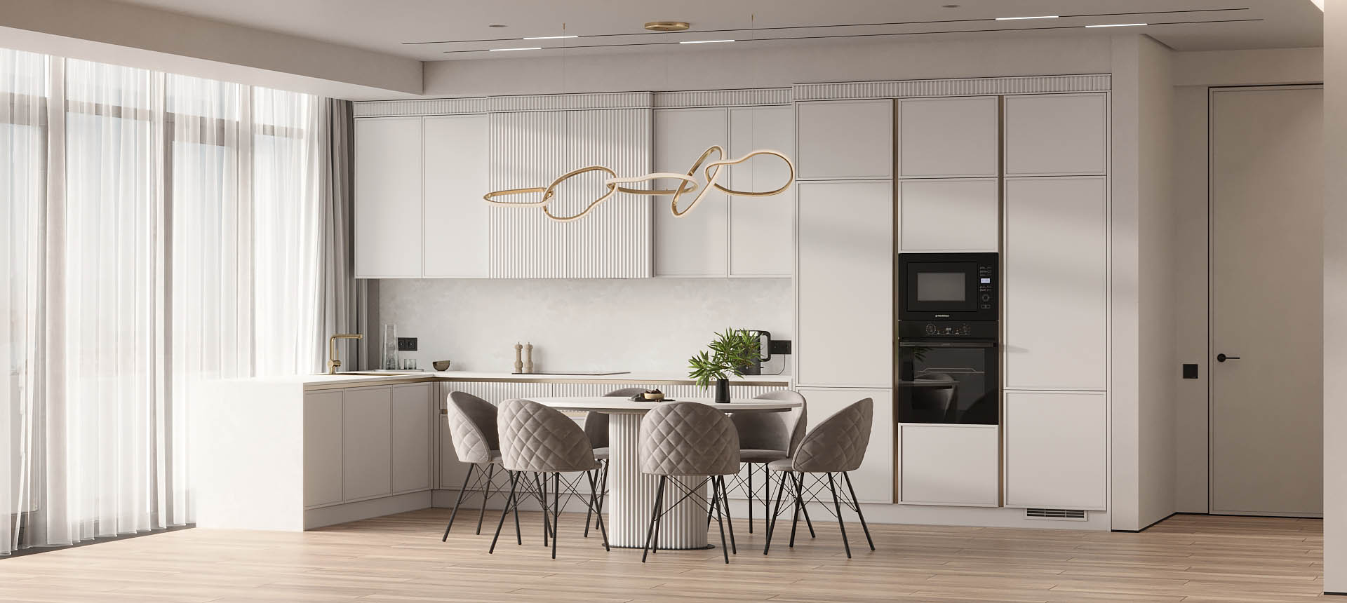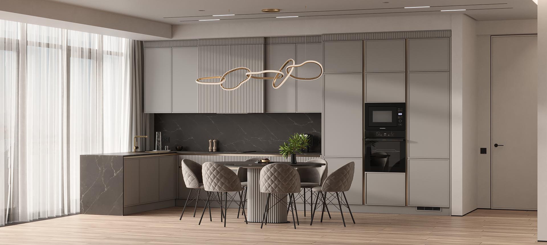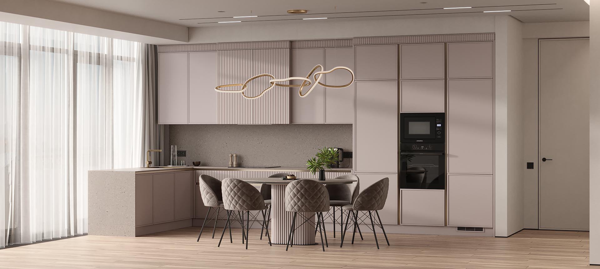 • Красивая кухня с золотыми акцентами в двухкомнатной квартире бизнес-класса