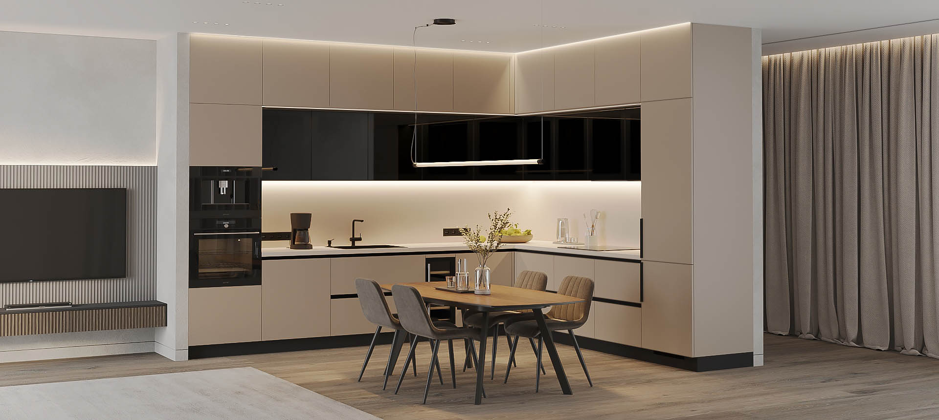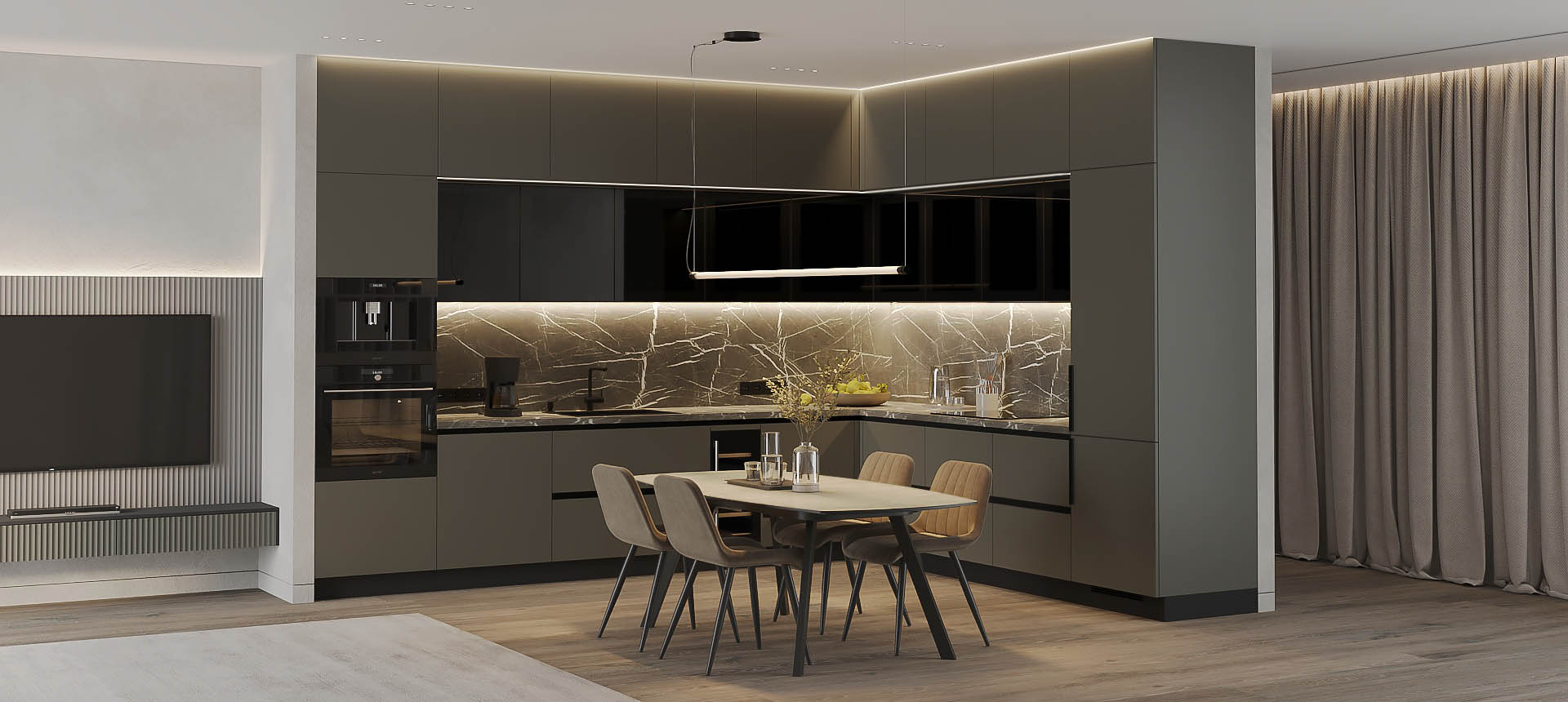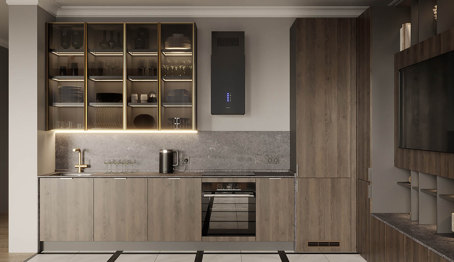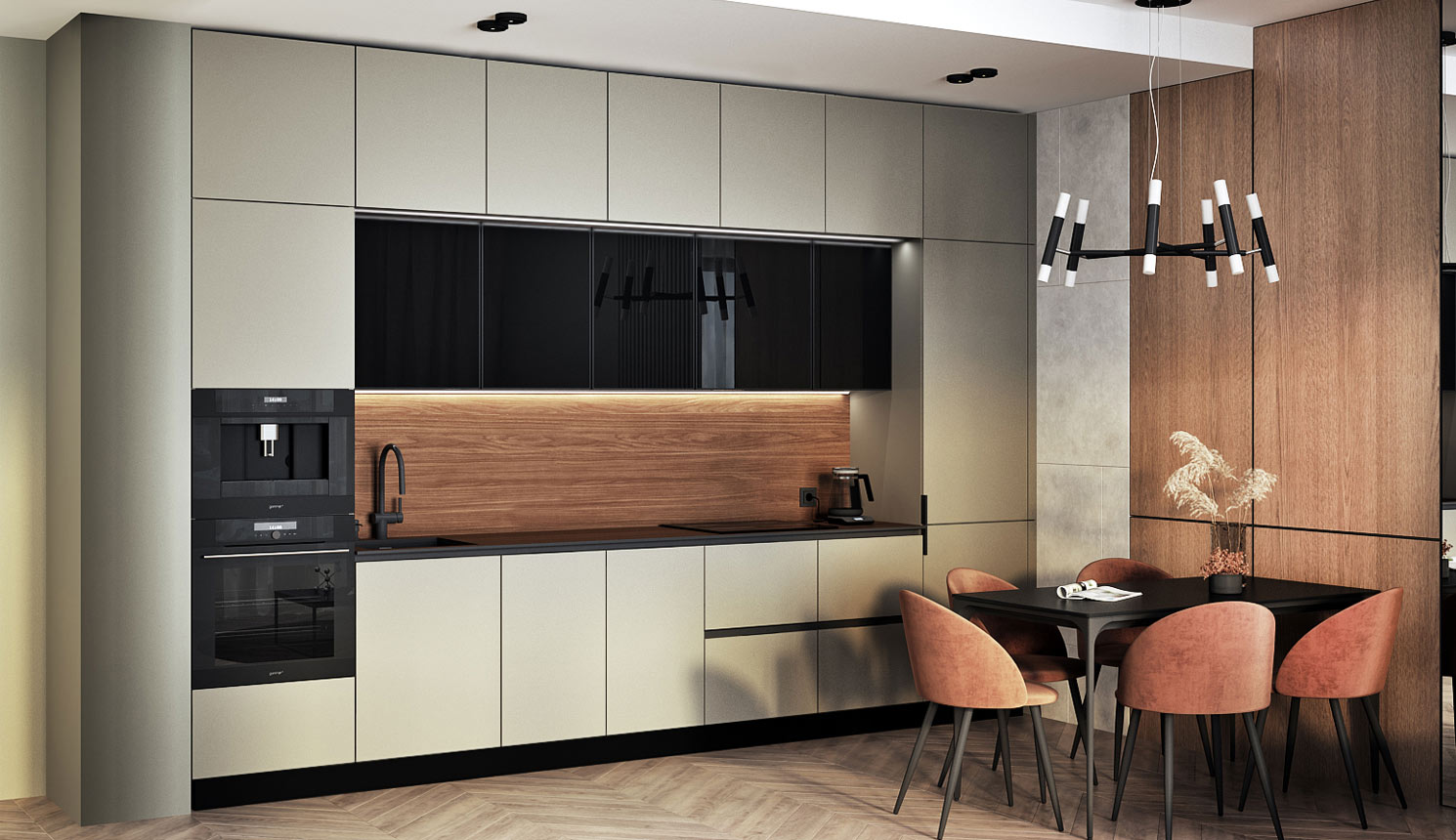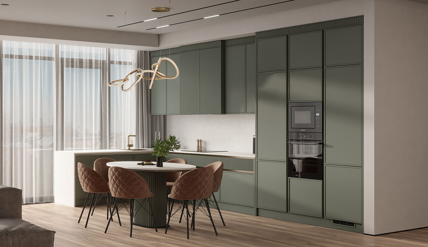 • Красивая кухня с золотыми акцентами в двухкомнатной квартире бизнес-класса
