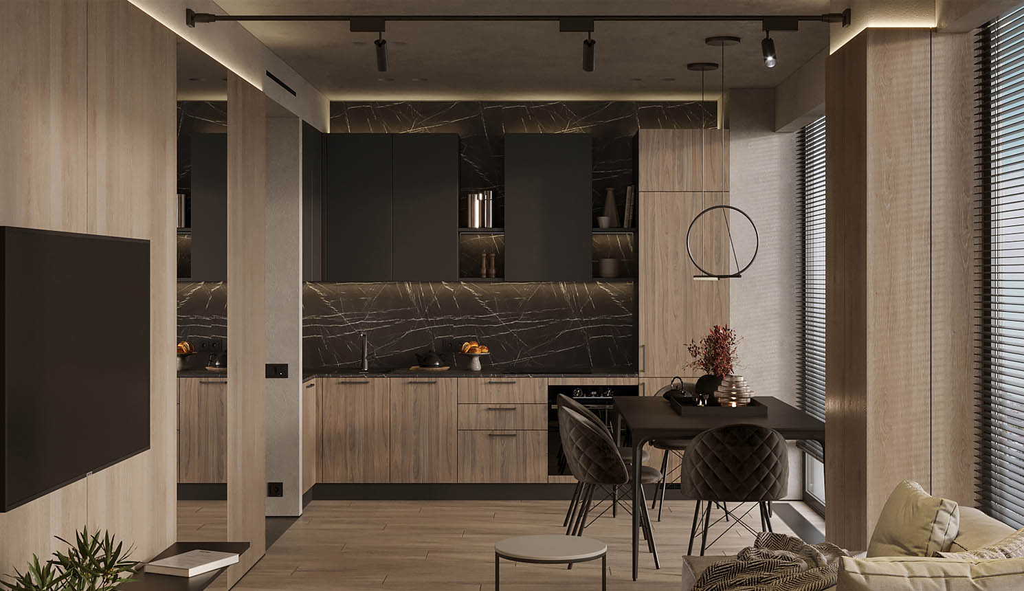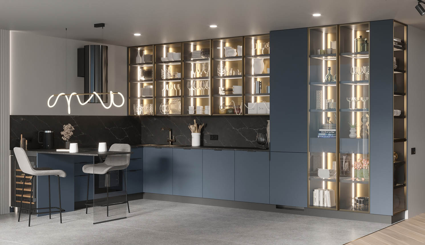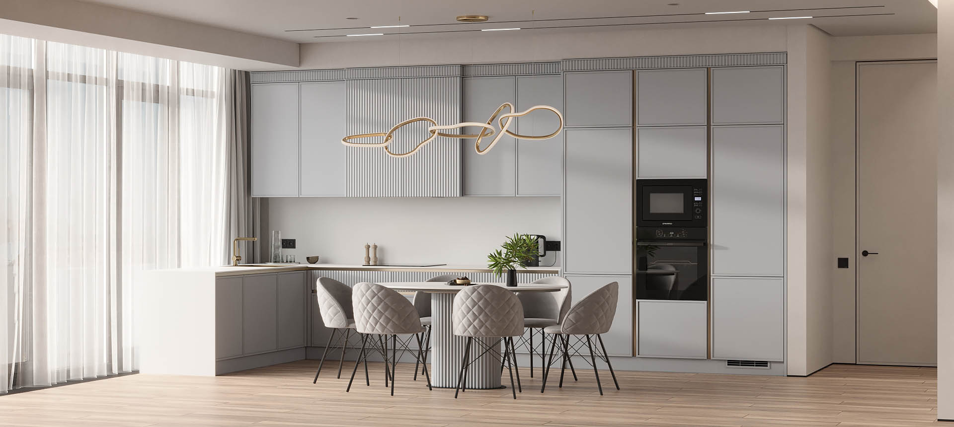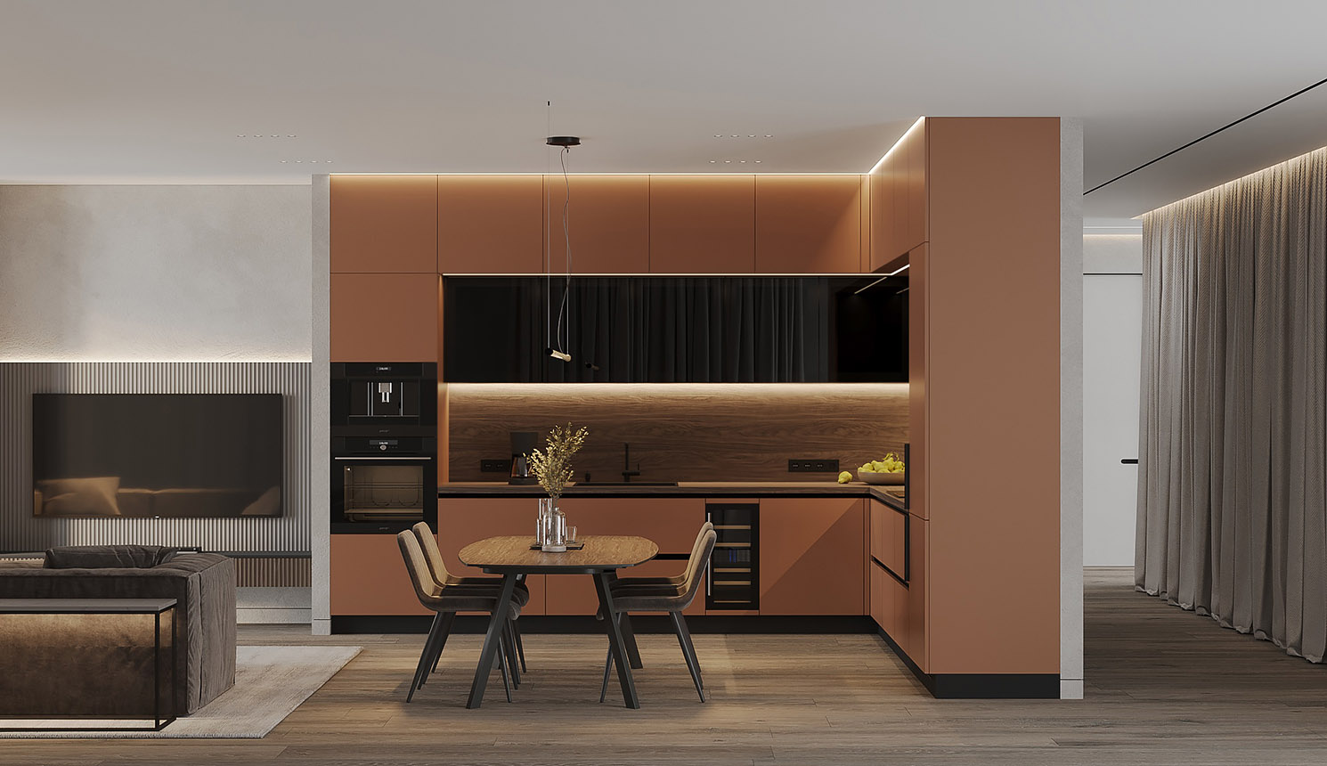 • Красивая кухня с золотыми акцентами в двухкомнатной квартире бизнес-класса