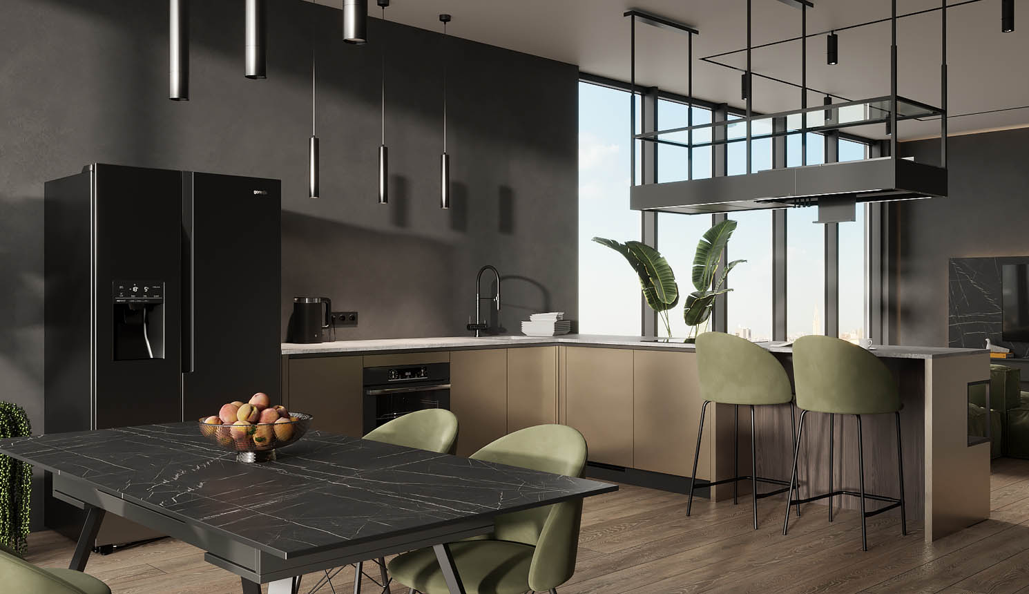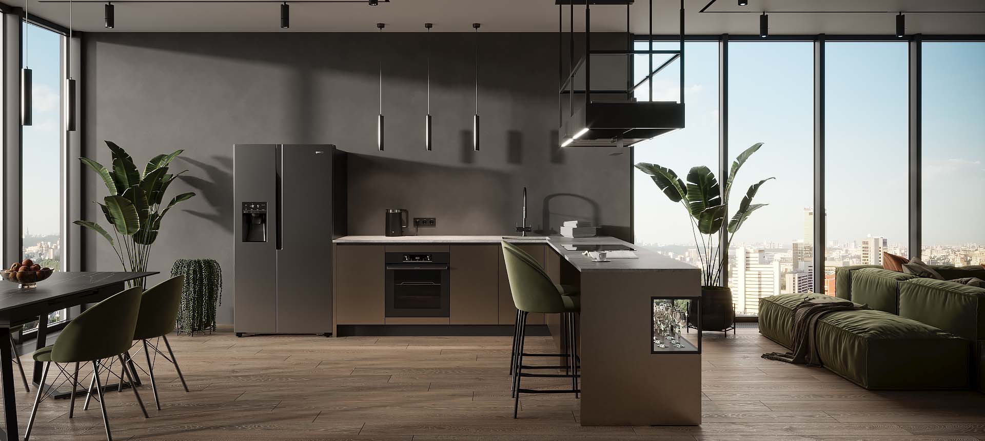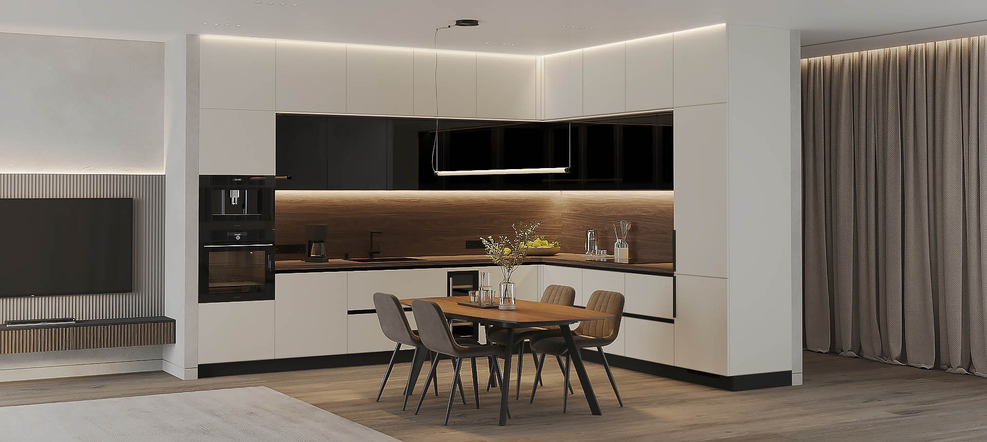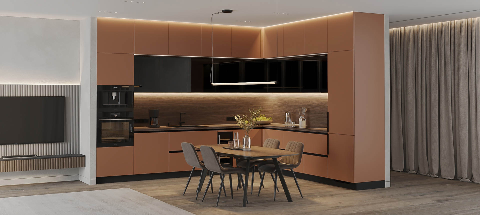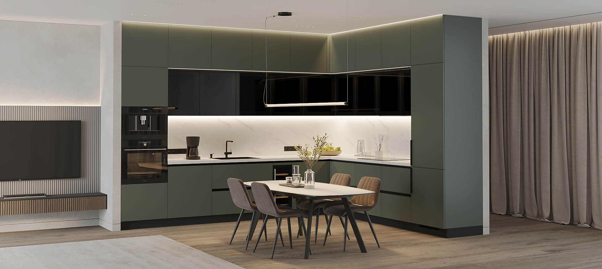 • Красивая кухня с золотыми акцентами в двухкомнатной квартире бизнес-класса