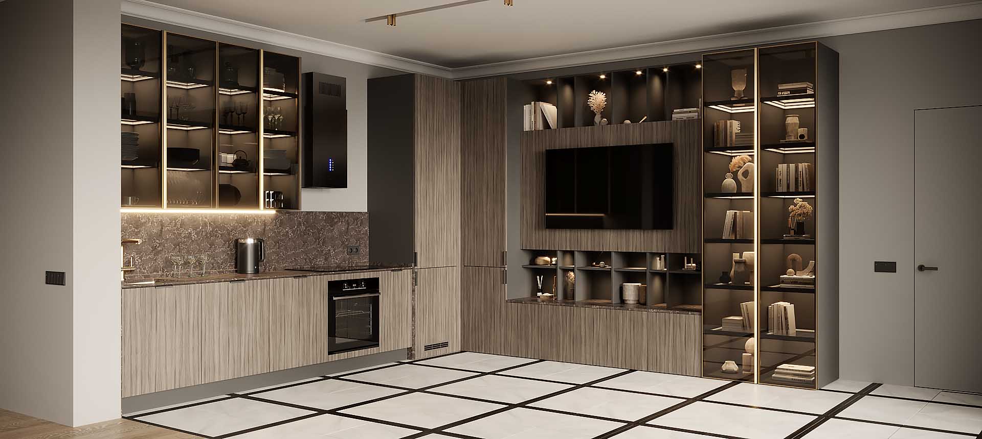 Красивая кухня с золотыми акцентами в двухкомнатной квартире бизнес-класса