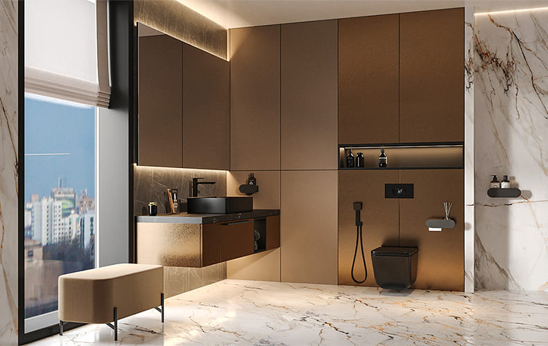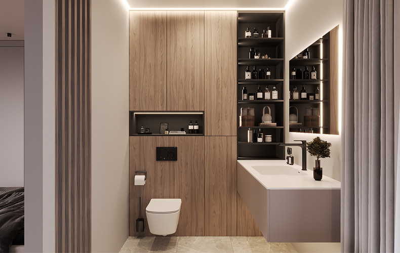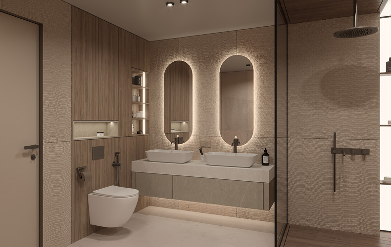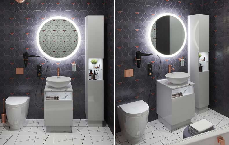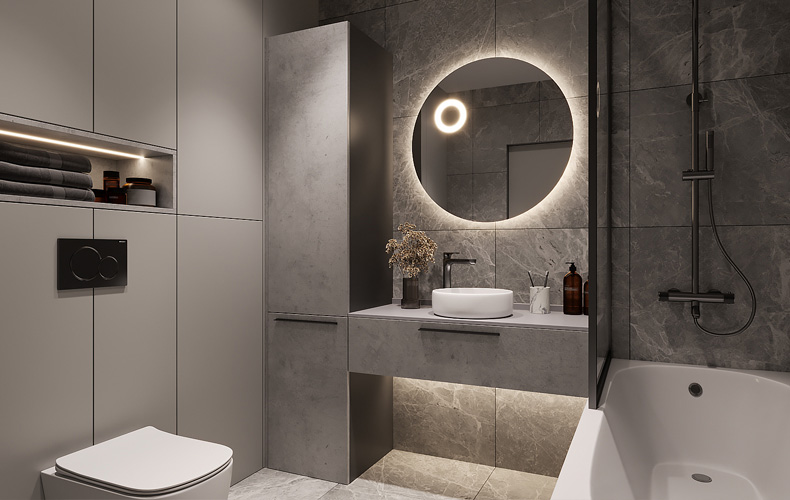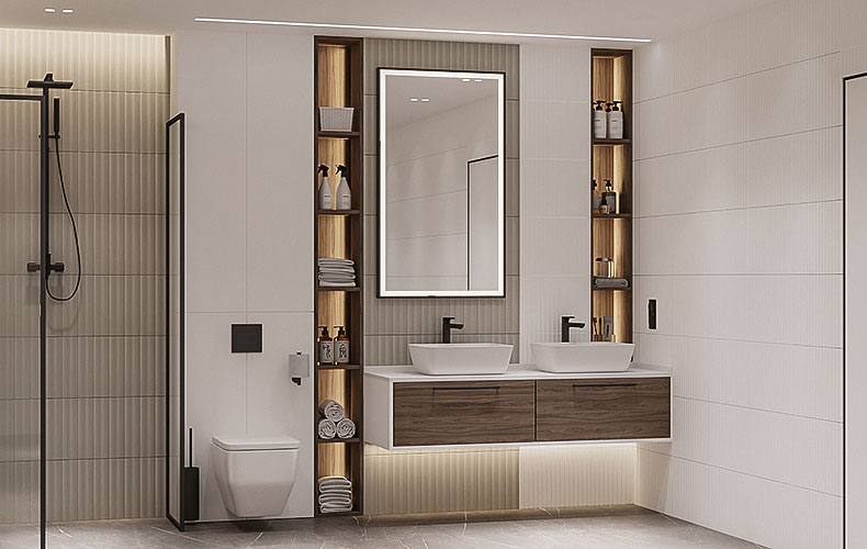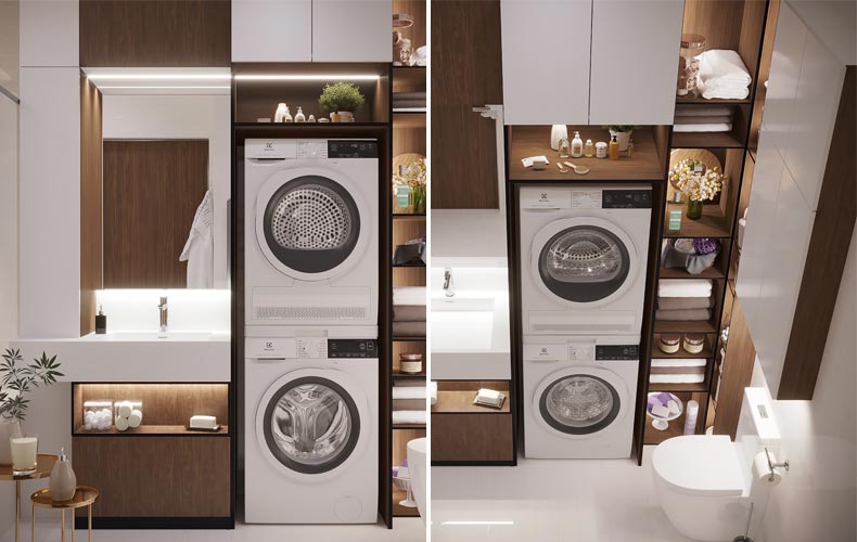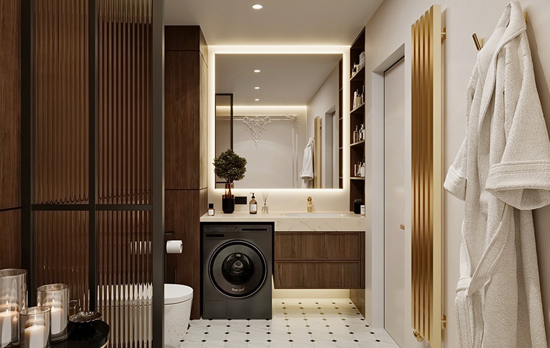 В коллекции предусмотрены функциональные детали — место для стиральной и сушильной машины вертикального монтажа, подсветка в шкафах, зеркало с интеграцией LED-подсветки по периметру, ниши и полки для хранения банных принадлежностей, косметики и парфюмерии, ящики для мелочей. Даже в небольшом помещении поместится все необходимое.