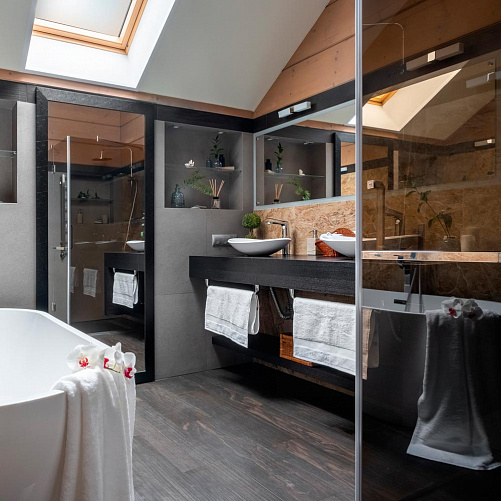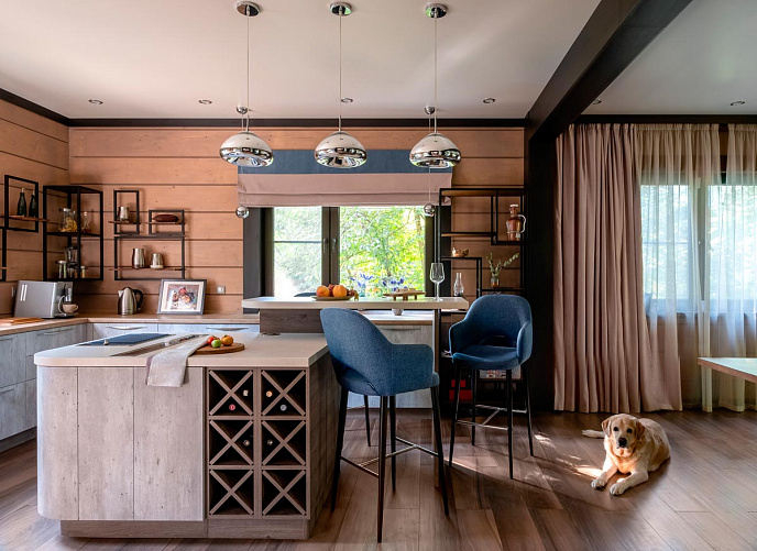 Первый этаж — воплощение идеального сценария, образа жизни заказчиков: в эргономичном и презентабельном холле удобно встречать гостей, уютная кухня-столовая располагает к кулинарному творчеству и непринужденным беседам, а в просторной гостиной предусмотрено все для отдыха за просмотром кино или игры в бильярд. Идея проекта заключалась в разделении пространства на зоны, плавно перетекающих друг в друга, объединяя при этом всех, кто находится в доме. На втором этаже приватная зона — мастер-спальня, с просторной гардеробной и собственным санузлом, спальня сына и гостевая спальня с вместительными встроенными шкафами, фасады которых после монтажа были отделаны декоративной штукатуркой, чтобы максимально органично вписаться в интерьер.