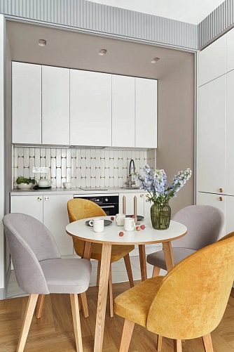 Контрастное сочетание белого и черного цветов — оригинальное решение для интерьера, которое всегда актуально. Из-за преобладания белого цвета даже маленькое помещение будет выглядеть больше. Черные столешница и фартук образуют нишу в рабочей зоне, от этого кухня смотрится еще больше. Компактный гарнитур позволяет разместить все необходимые принадлежности в шкафах и ящиках, оснастить кухню встроенной техникой и готовить с комфортом и удовольствием.
