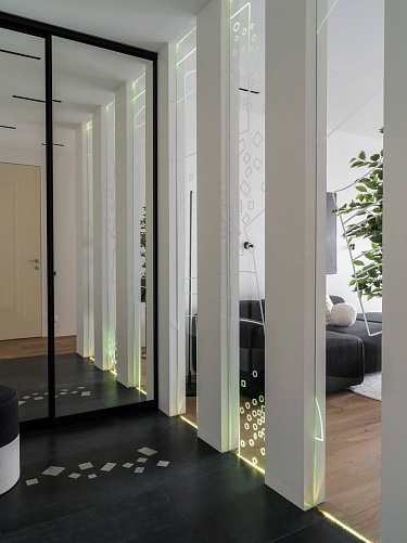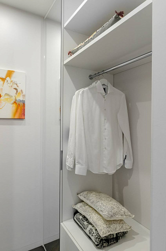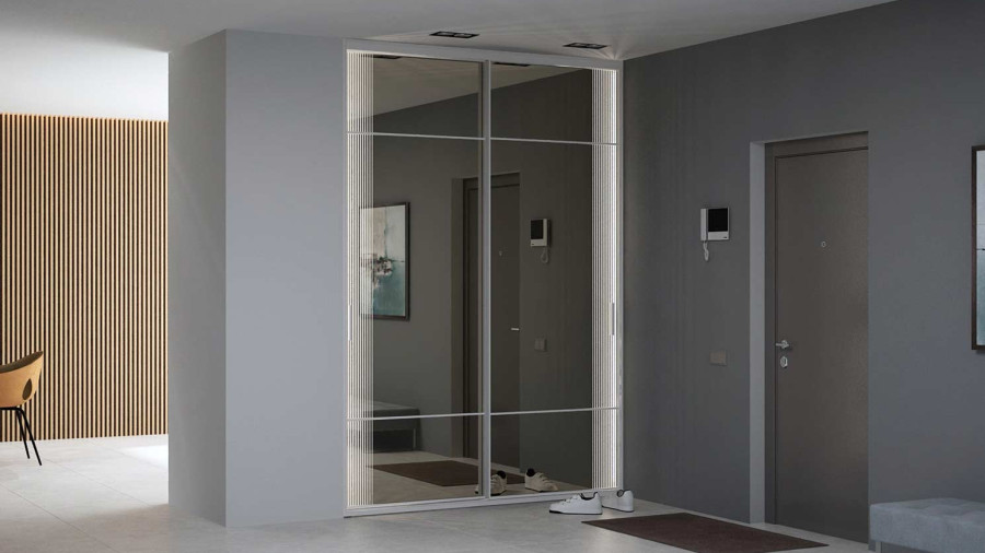 Вместительная и практичная конструкция шкафа-купе идеально подходит для прихожей. Внутри предусмотрены полки для хранения головных уборов, обуви, аксессуаров, а также штанга для верхней одежды. Двери выполнены из стекла, шкаф имеет дополнительную подсветку.