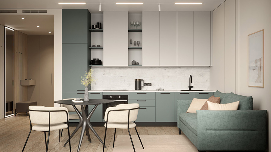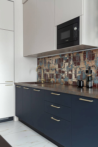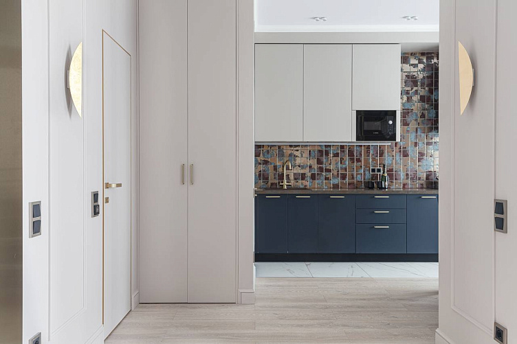 Встроенный шкаф и двери оформлены в едином тоне со стенами — решение, которое визуально делает пространство чище и спокойнее. Минималистичные ручки и аккуратные золотые детали поддерживают общий ритм дизайна. Контраст нижних темно-синих фасадов и светлых верхних шкафов создает гармоничный визуальный баланс. Керамический фартук добавляет живости, отражая свет и меняя оттенки в зависимости от освещения. Матовое золото смесителя и фурнитуры добавляют интерьеру шарма.