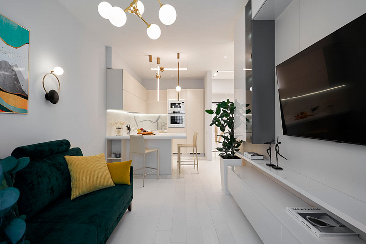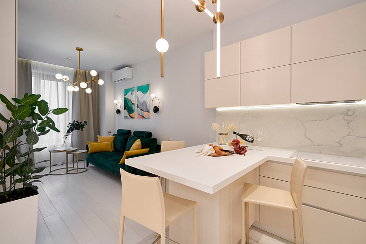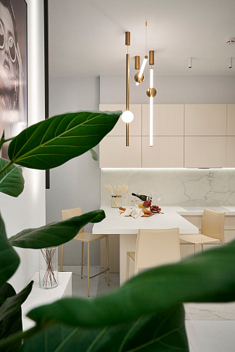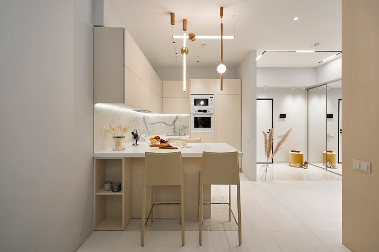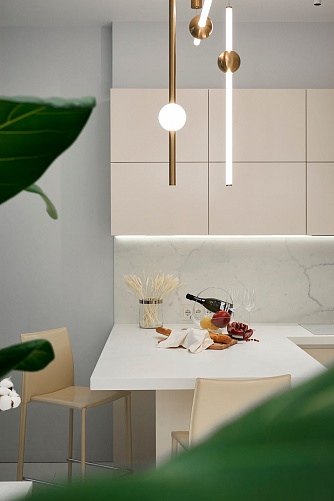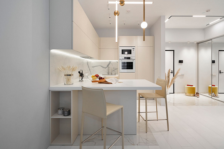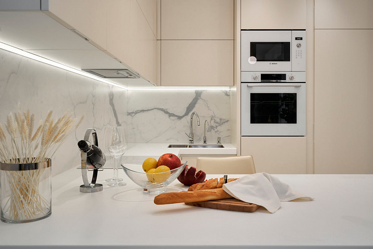 Кухня в проекте выполнена в едином нежном матовом молочном цвете, с большим полубарным столом из белого искусственного камня и соединена с гостиной зоной. Опорой для стола служит неглубокий корпус кухни с интегрированными ящиками с рабочей стороны и выдвижной секцией для хранения бутылок. Так же было решено использовать белую встроенную технику, что не выходит из общей концепции квартиры. Был установлен встроенный холодильник без морозильной камеры, а ее успешно вынесли в отдельную секцию. Над ней разместился духовой шкаф и СВЧ. На фартук был установлен белый матовый широкоформатный керамогранит «laminam» с фактурой под «Мрамор calacatta».