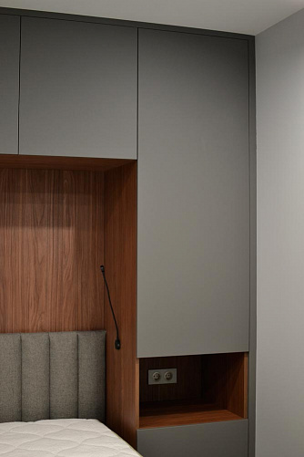 Для создания встроенной подсветки и изголовья, встроенного в стену, нам пришлось нарастить небольшие участки стен на толщину изголовья и подсветки, таким образом изголовье вошло в единую линию со стеной, а подсветка дала легкий рассеивающий свет.
