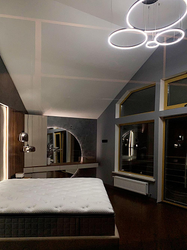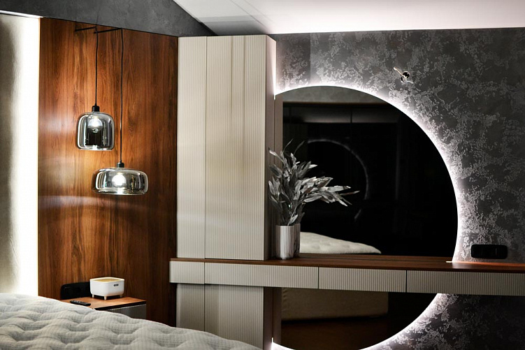 Дальше встал вопрос с освещением пространства. Потолки в помещении разные, самая высокая точка 3.80м, а самая низкая 2.30м. Я создала сразу несколько сценариев освещения. Основное потолочное, второе подвесное бра, которое выходит из стеновых панелей высотой 2.30м, добавилась декоративная подсветка изголовья (тоже 2,30м) и отдельно создали круглое зеркало-трюмо с подсветкой, которое создало впечатление футуристической картинки в целом.