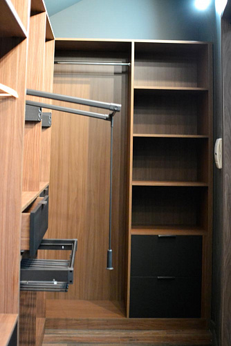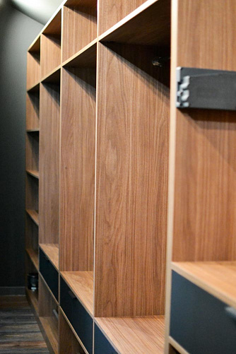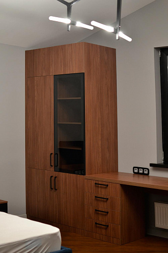 Спальня ассиметричной формы уже создает сложность в правильном оформлении пространства. Множество углов с спальне сбивало с толку с первых шагов. Поэтому изначально стояла задача в логической организации пространства. Мы снесли старую гардеробную и организовали новую в 8 м2, которую скрыли красивыми дверями купе в цвете графит.