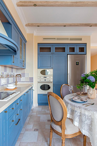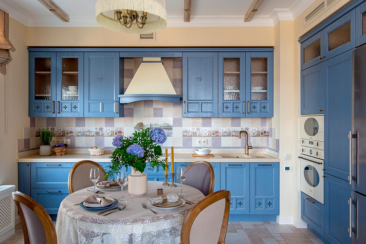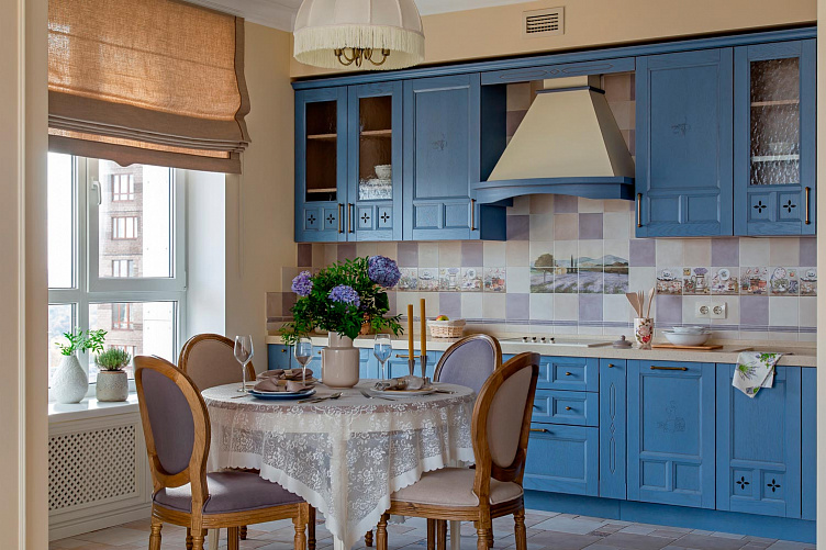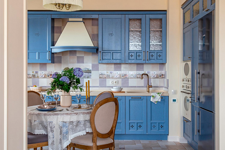 Изначально кухню планировали в оливково-мятном цвете, но когда заказчики пришли в салон и увидели на экспозиции кухню в цвете синей лаванды, они сразу решили, что хотят именно такое сочетание.