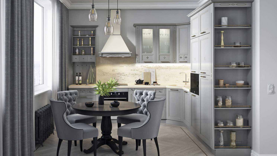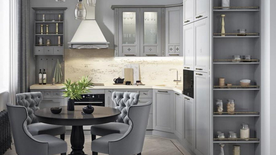Кухонный гарнитур Оливия выполнен в оригинальном сером цвете. Это образец классического исполнения мебели для современных интерьеров: в дизайне использованы элементы кантри-направления и приёмы неоклассицизма. Рамочные фасады изготовлены из массива и шпона дуба. Поверхности декорированы оригинальной фрезеровкой и патиной. Кухня имеет угловую конструкцию и может использоваться для небольших по размеру помещений. Для хранения принадлежностей предусмотрены распашные шкафы, выдвижные ящики, навесные системы с витражами и открытые полки. Мебель оснащена встроенной техникой и подсветкой.